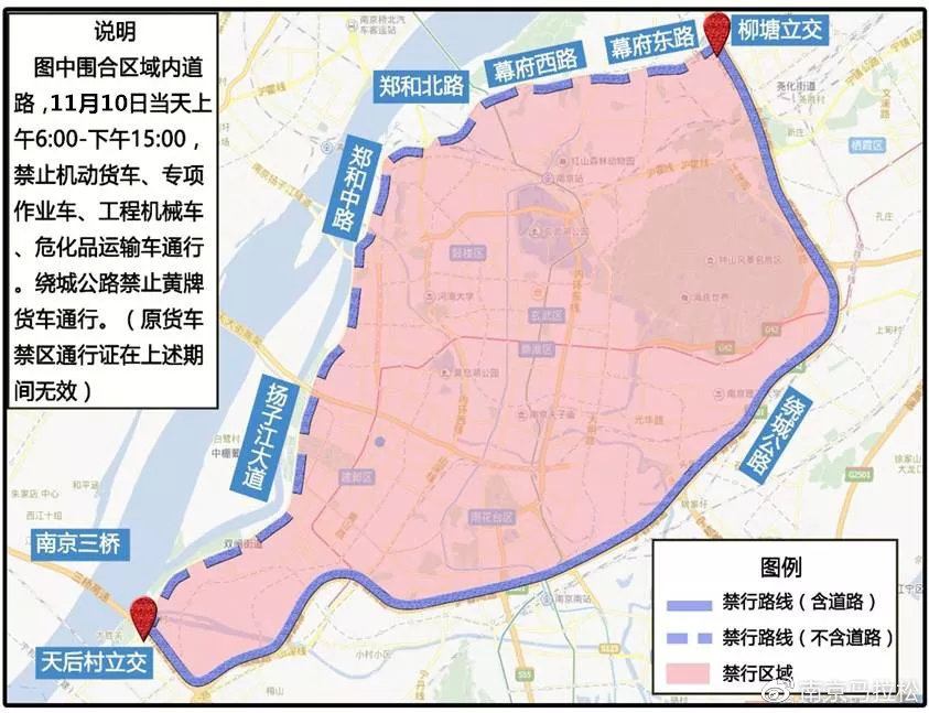 本市幕府东路、幕府西路、郑和北路、郑和中路、扬子江大道、绕城公路(不含上述道路)合围区域内禁止机动货车、专项作业车、工程机械车、危化品运输车通行;绕城公路(柳塘立交至天后村互通段)在上述时间段内禁止黄牌货车通行。同时,持货车禁区通行证的车辆不得在上述限行区域、路段内行驶。